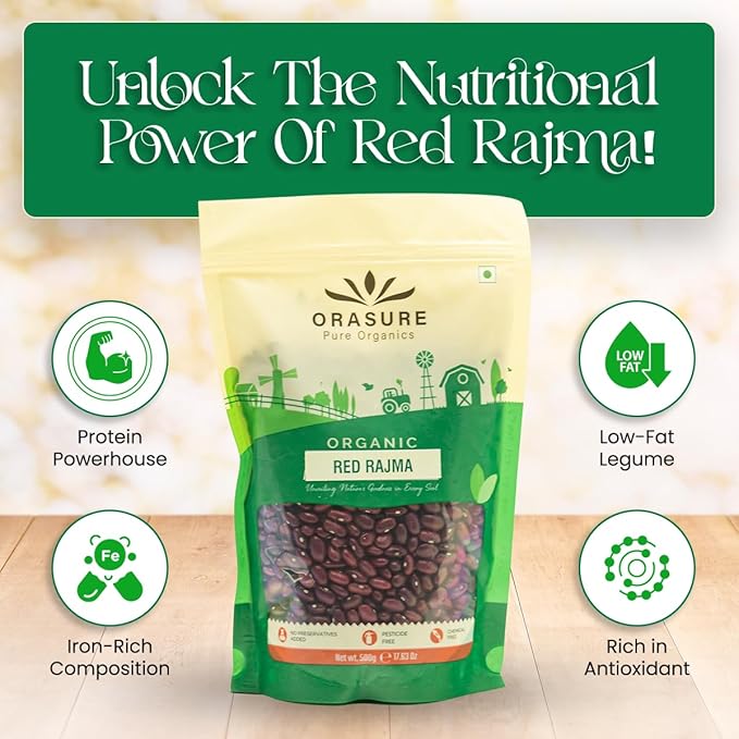 Orasure Organic Red Rajma is a protein-packed legume rich in dietary fiber, iron, and magnesium. It supports digestion, boosts energy, and promotes overall wellness. Perfect for preparing flavorful curries and stews, Orasure Organic Red Rajma ensures delicious and wholesome meals.